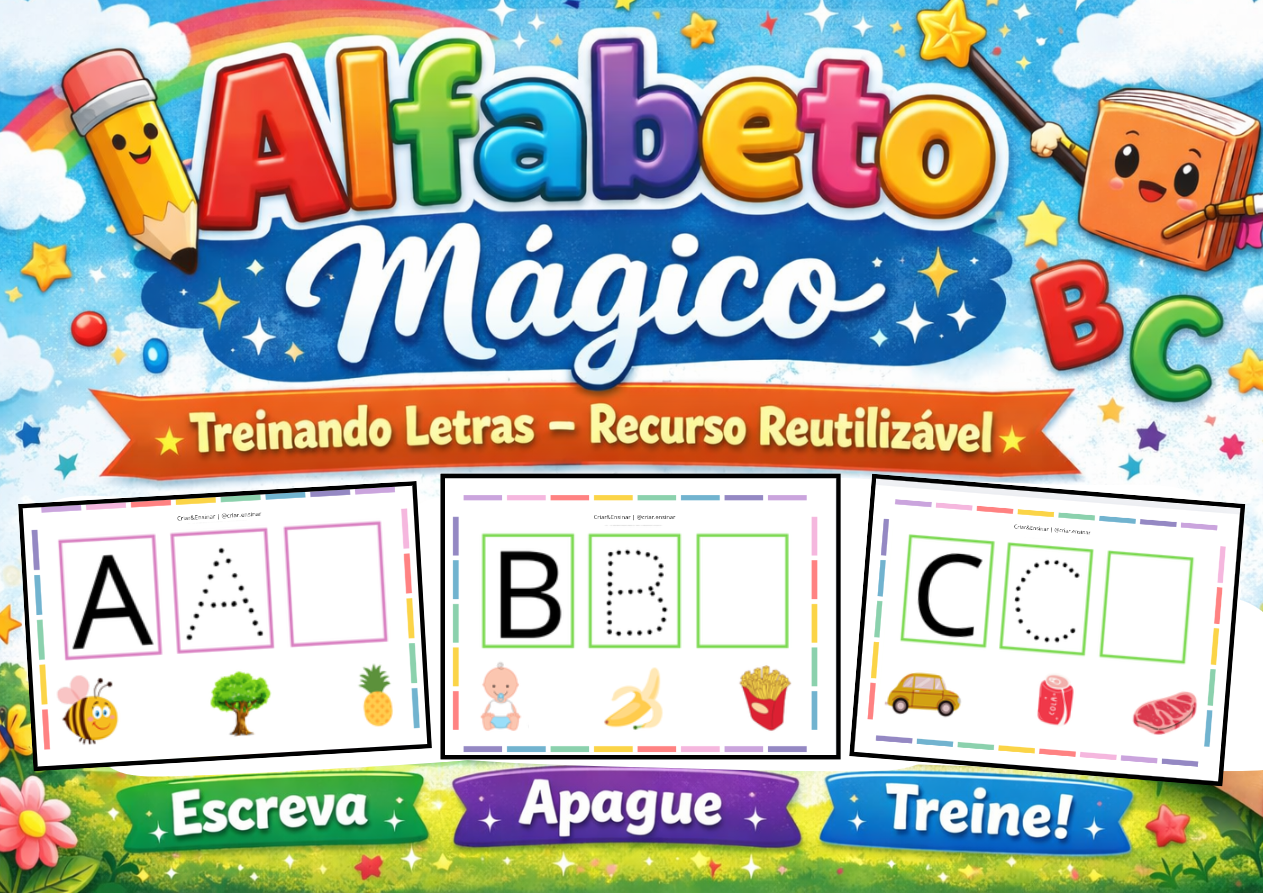 O Alfabeto Mágico é um recurso pedagógico desenvolvido para auxiliar professores no processo de alfabetização de forma lúdica, visual e significativa. O material estimula o reconhecimento das letras do alfabeto, a associação entre letras e imagens e o desenvolvimento das habilidades iniciais de leitura e escrita.