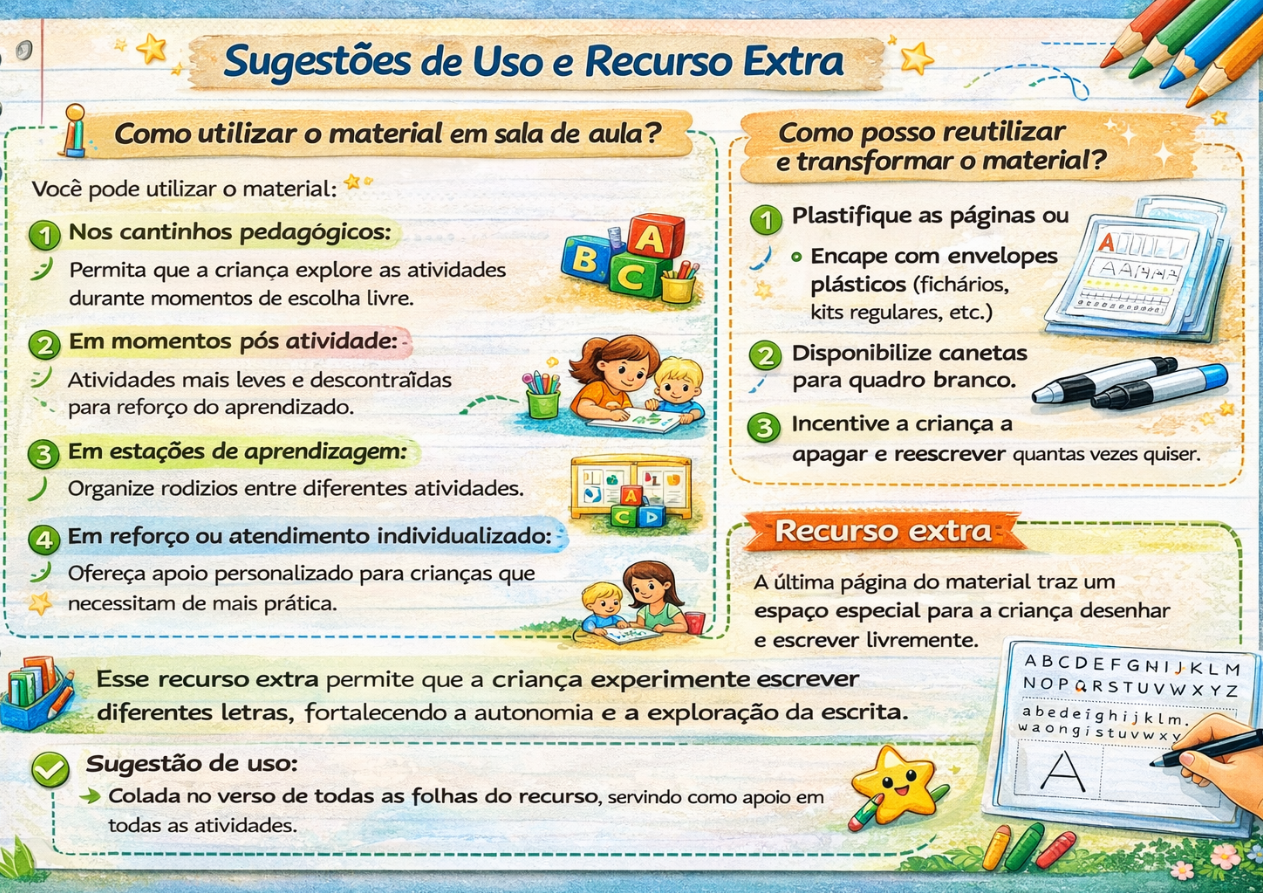 Este material é ideal para ser utilizado em sala de aula, em atividades dirigidas, cantinhos de aprendizagem, intervenções pedagógicas ou como reforço escolar.