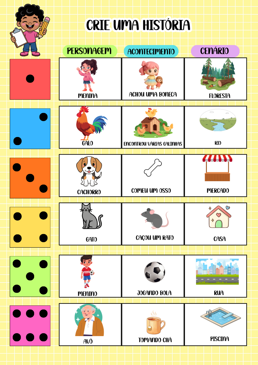 Com ele, as crianças são convidadas a inventar personagens, cenários e acontecimentos, desenvolvendo habilidades essenciais para a aprendizagem, como:
