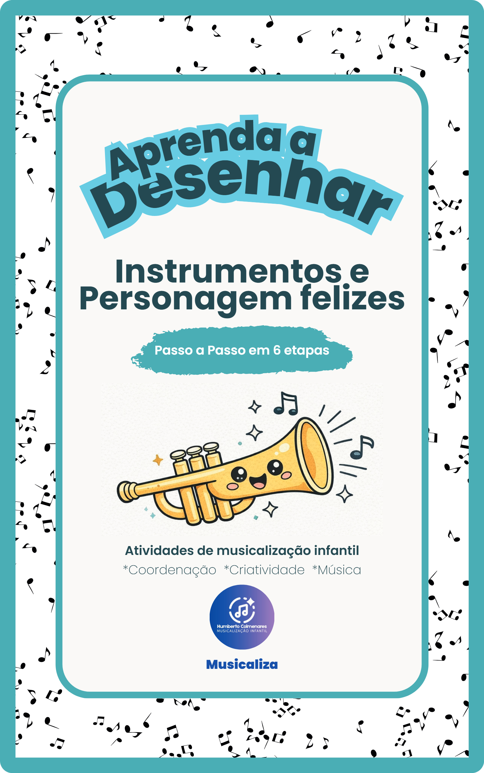 Ebook educativo com desenhos musicais infantis e tutoriais passo a passo em 6 etapas, desenvolvido para crianças de 6 a 8 anos. Estimula coordenação m