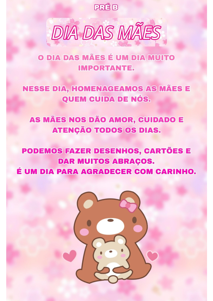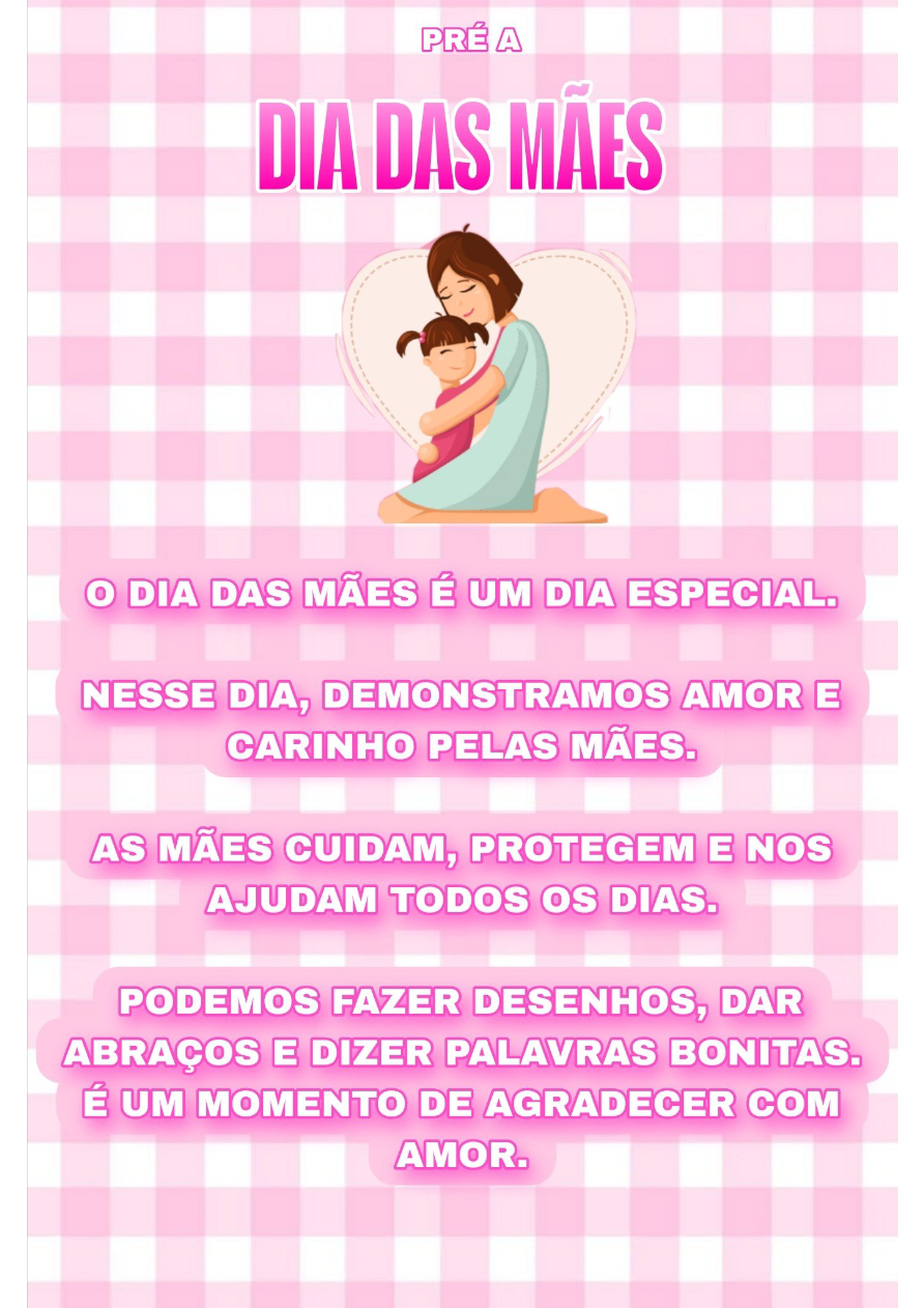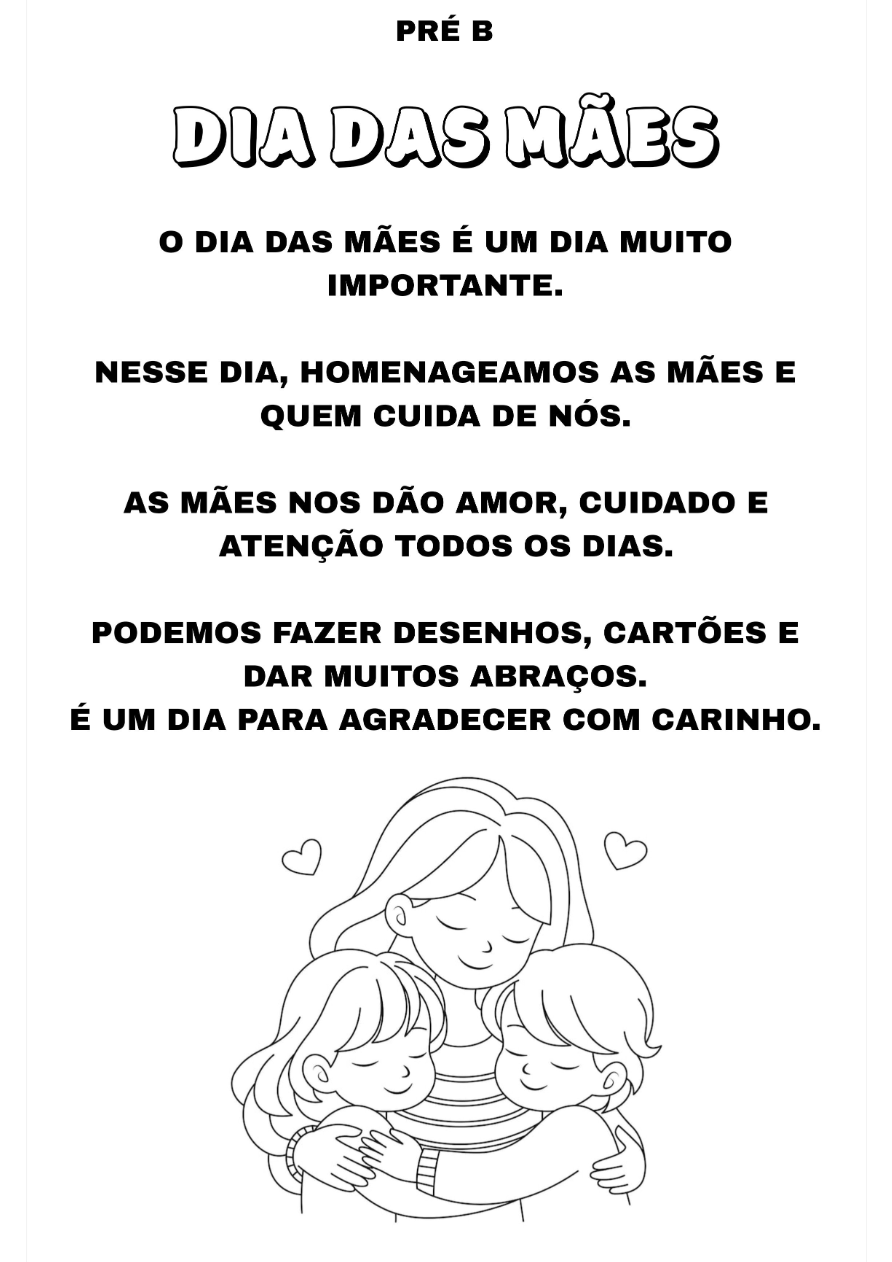 Folhas de textos explicativos sobre o dia das mães para crianças do Pré A ao 5° ano.