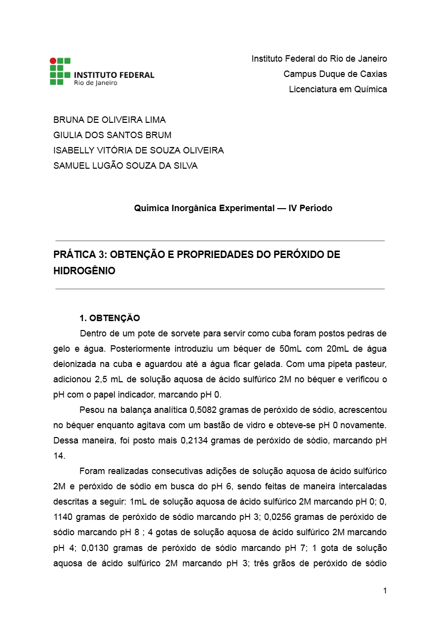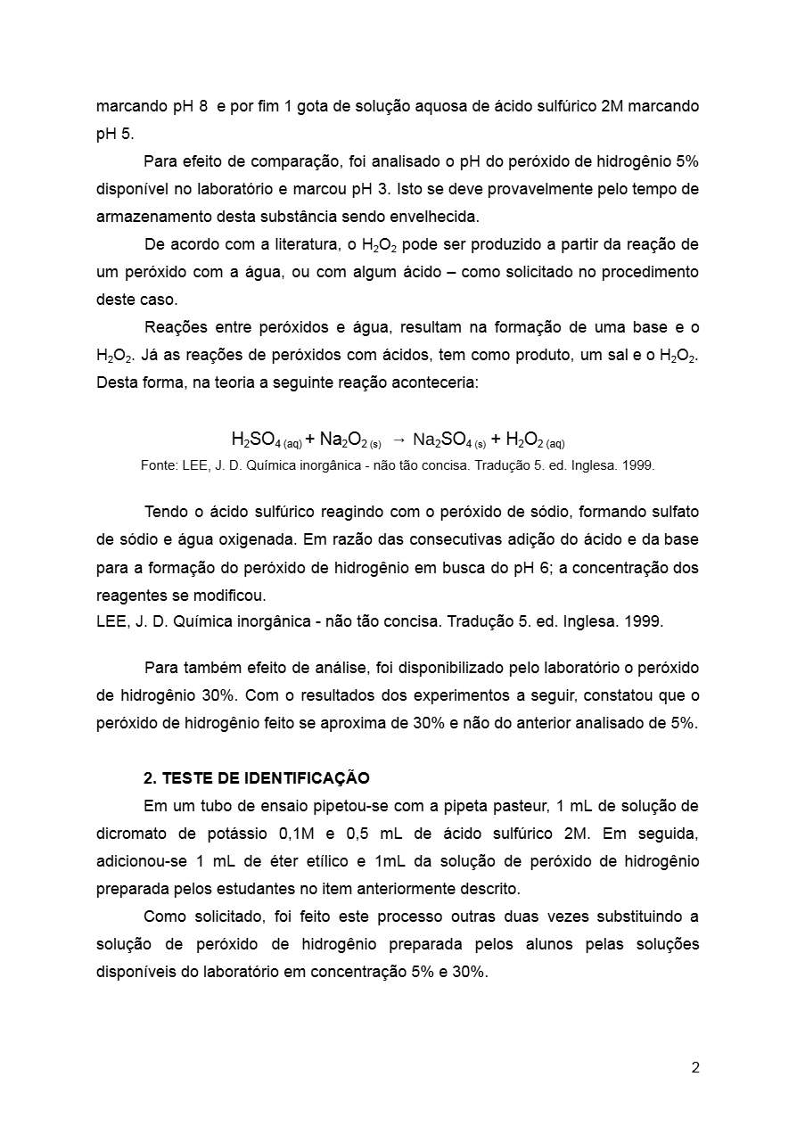 Relatório completo com experimentos, reações e análise do H2O2 para aulas de Química