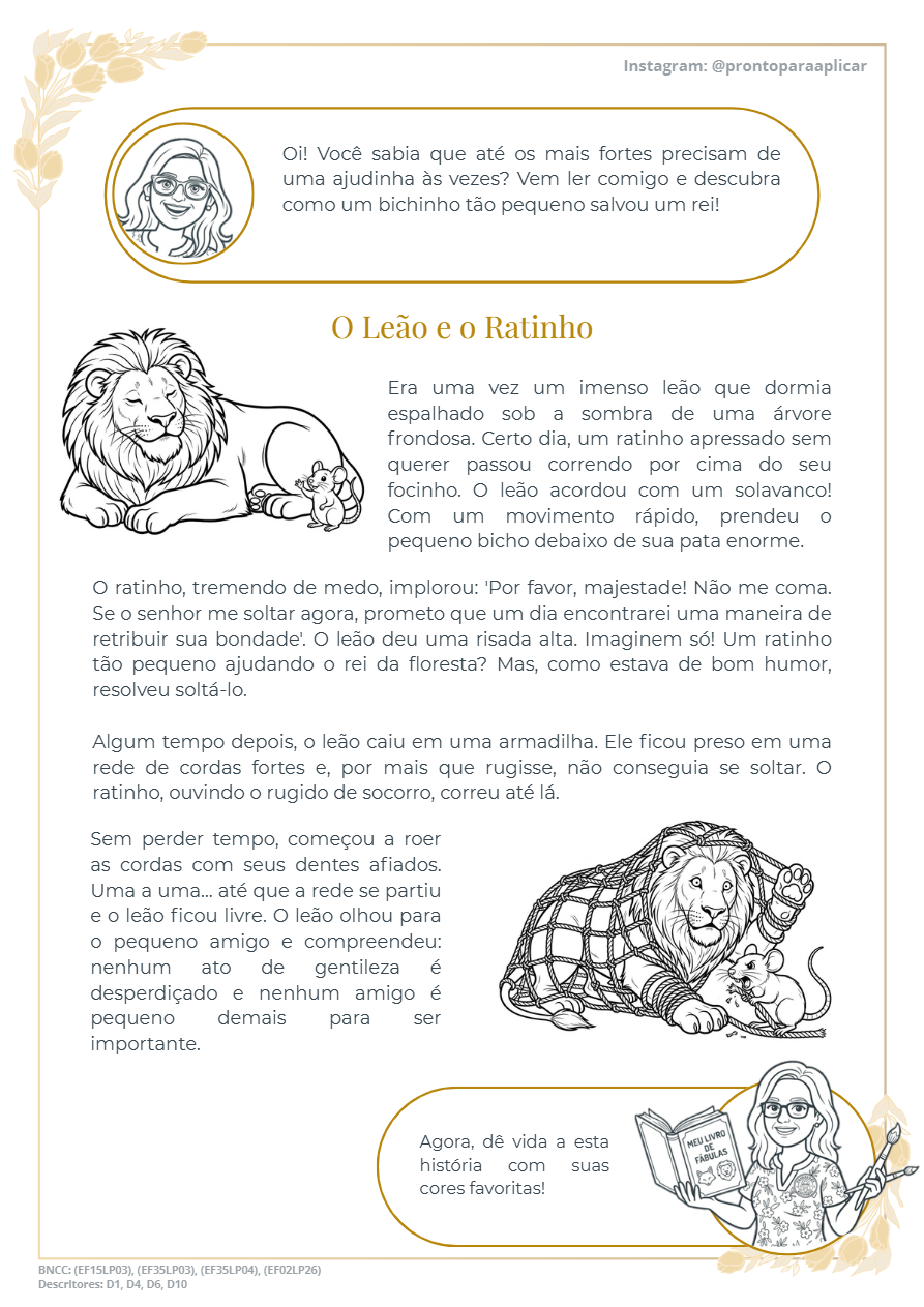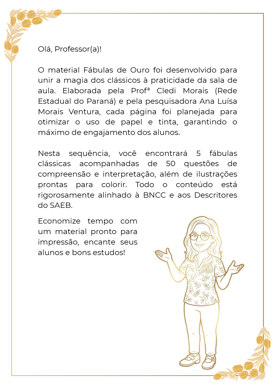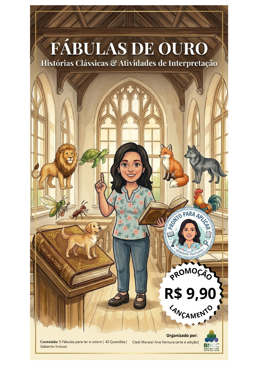Apresento as Fábulas de Ouro: uma sequência didática completa para 2º e 3º ano, criada por quem vive o chão da escola. São 5 fábulas clássicas, 40 questões e ilustrações para colorir, tudo alinhado à BNCC! ✅