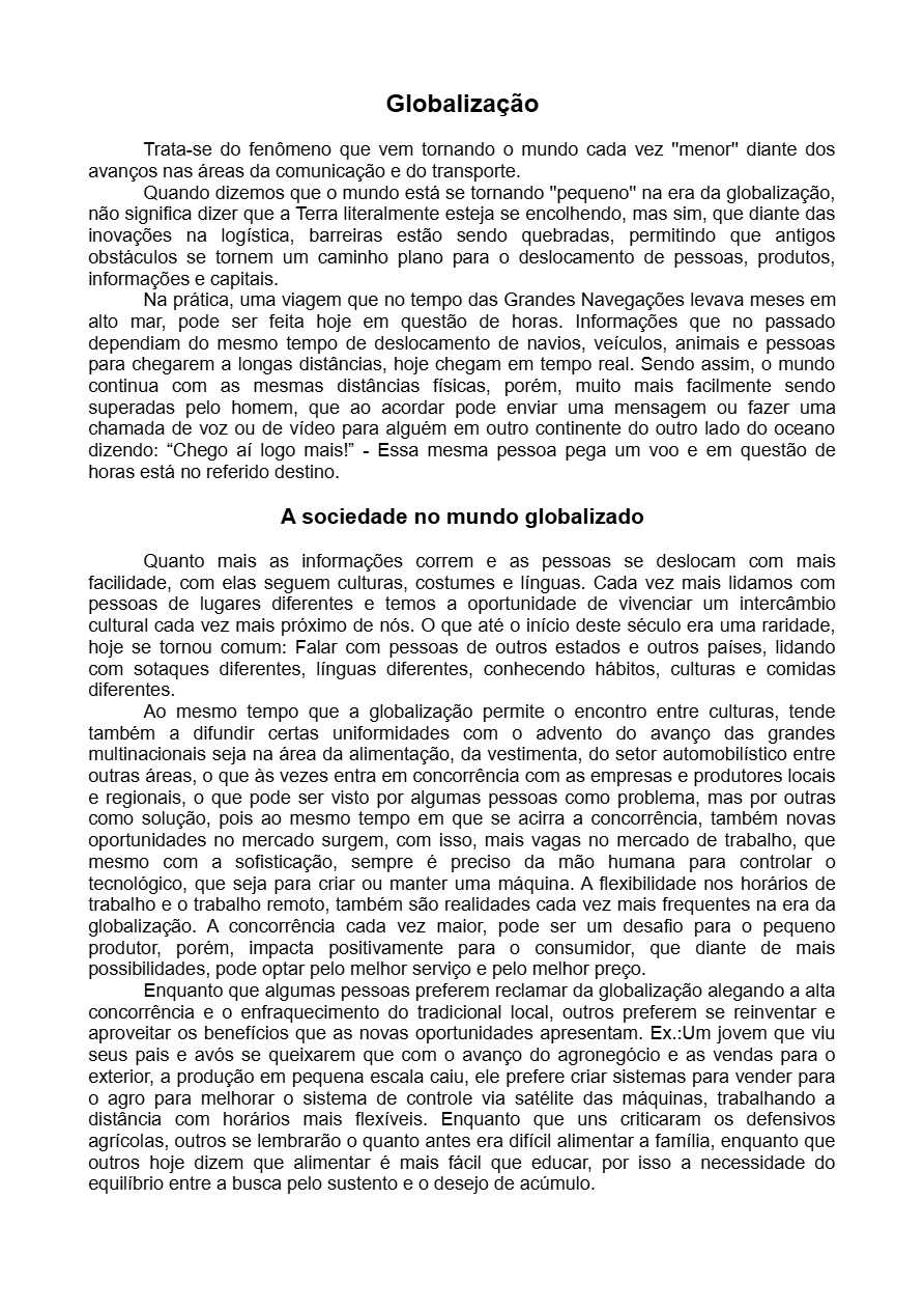 Resumo de 1 página: Título - Globalização (16 linhas / 3 parágrafos); Subtítulo - A sociedade no mundo globalizado (30 linhas / 3 parágrafos)