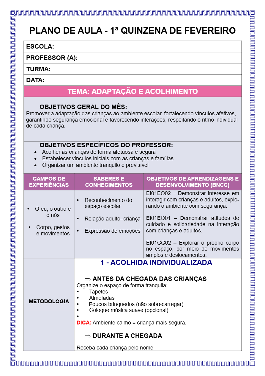 Este material é um plano de aula completo para Educação Infantil, elaborado com base nas orientações da BNCC, com objetivos de aprendizagem claros e atividades organizadas de forma prática e funcional para o dia a dia do professor.