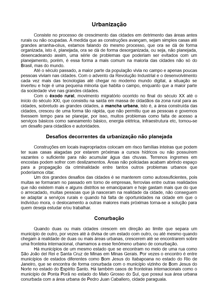 3títulos:Urbanização(19linhas/3parágrafos);Desafios decorrentes da urbanização não planejada(13linhas/2parágrafos) e Conurbação(11 linhas/2parágrafos)
