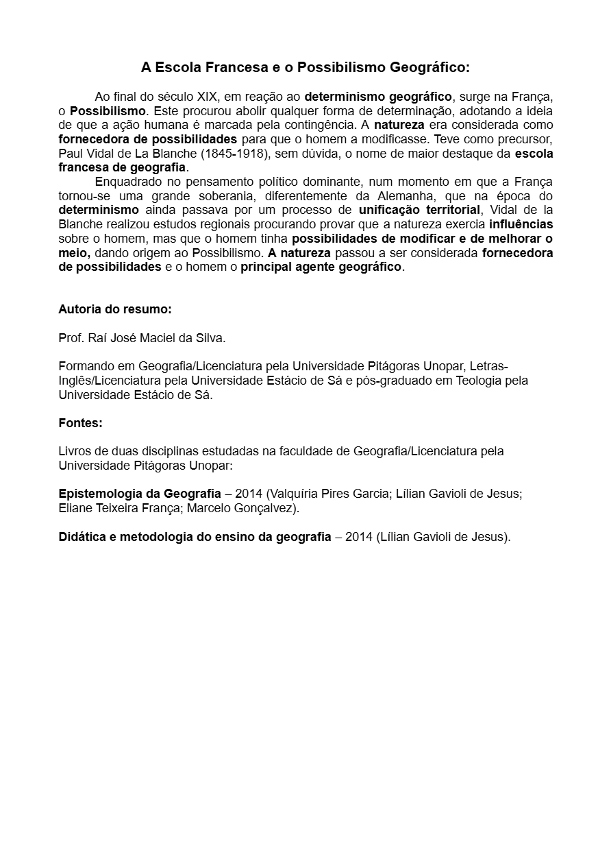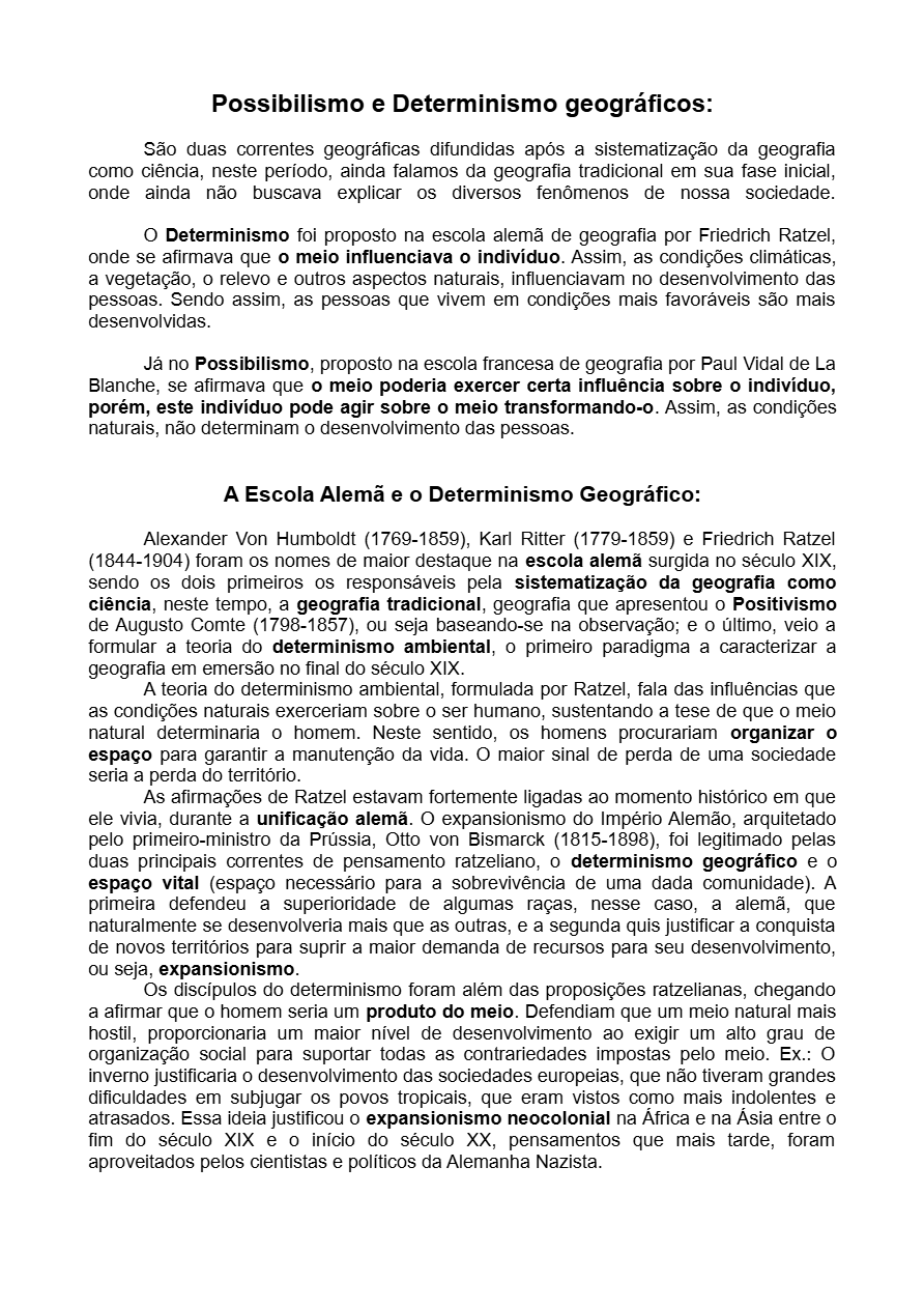 Resumo (pouco mais de 1 folha) sobre o Possibilismo e Determinismo geográficos - Escolas francesa e alemã de geografia - Para Ensino Médio e Faculdade