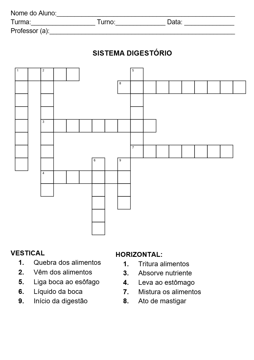 Esta atividade de cruzadinha sobre o sistema digestório foi elaborada para auxiliar os alunos na compreensão dos principais órgãos e funções do processo de digestão de forma lúdica e envolvente.