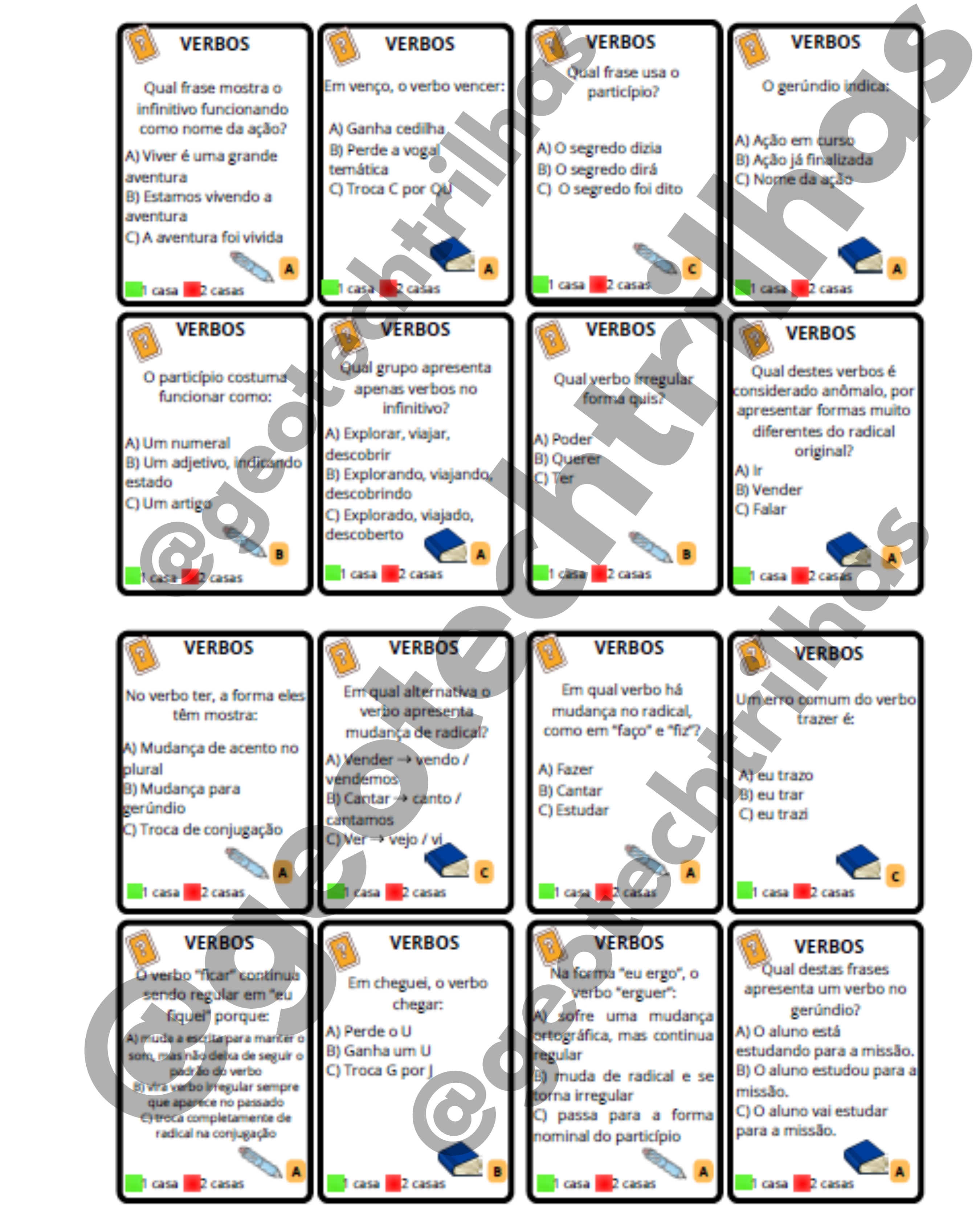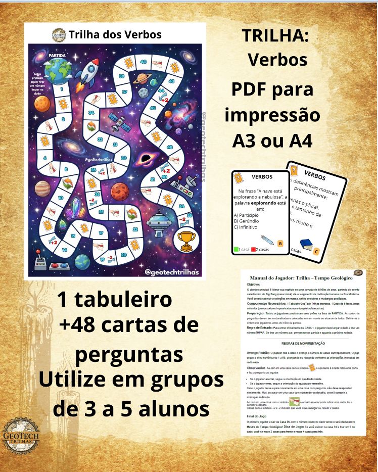 A Trilha dos Verbos é um recurso pedagógico lúdico e envolvente para trabalhar conteúdos de Língua Portuguesa de forma leve, interativa e significativa. Por meio de um tabuleiro com percurso numerado, regras simples e cartas-desafio, os estudantes aprendem e revisam conceitos importantes sobre os verbos enquanto jogam. O material aborda temas como radical, vogal temática, desinências, verbos regulares e irregulares, mudanças ortográficas e formas nominais.