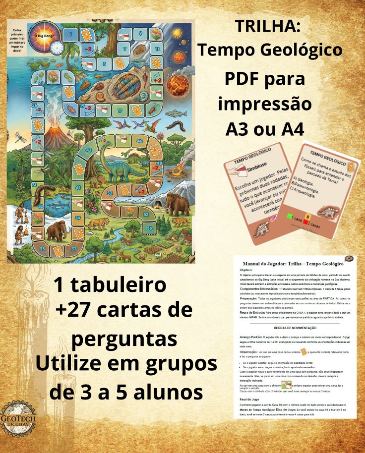 Leve seus alunos em uma jornada pelo Tempo Geológico de forma lúdica, dinâmica e envolvente. Este jogo de tabuleiro foi desenvolvido por uma professora de Geografia especialista em Educação Ambiental para tornar o conteúdo mais significativo e a aula mais divertida.